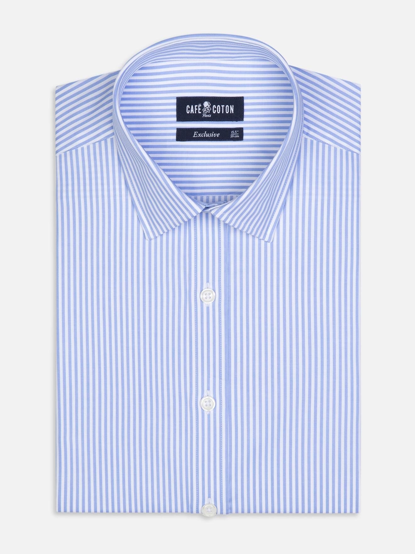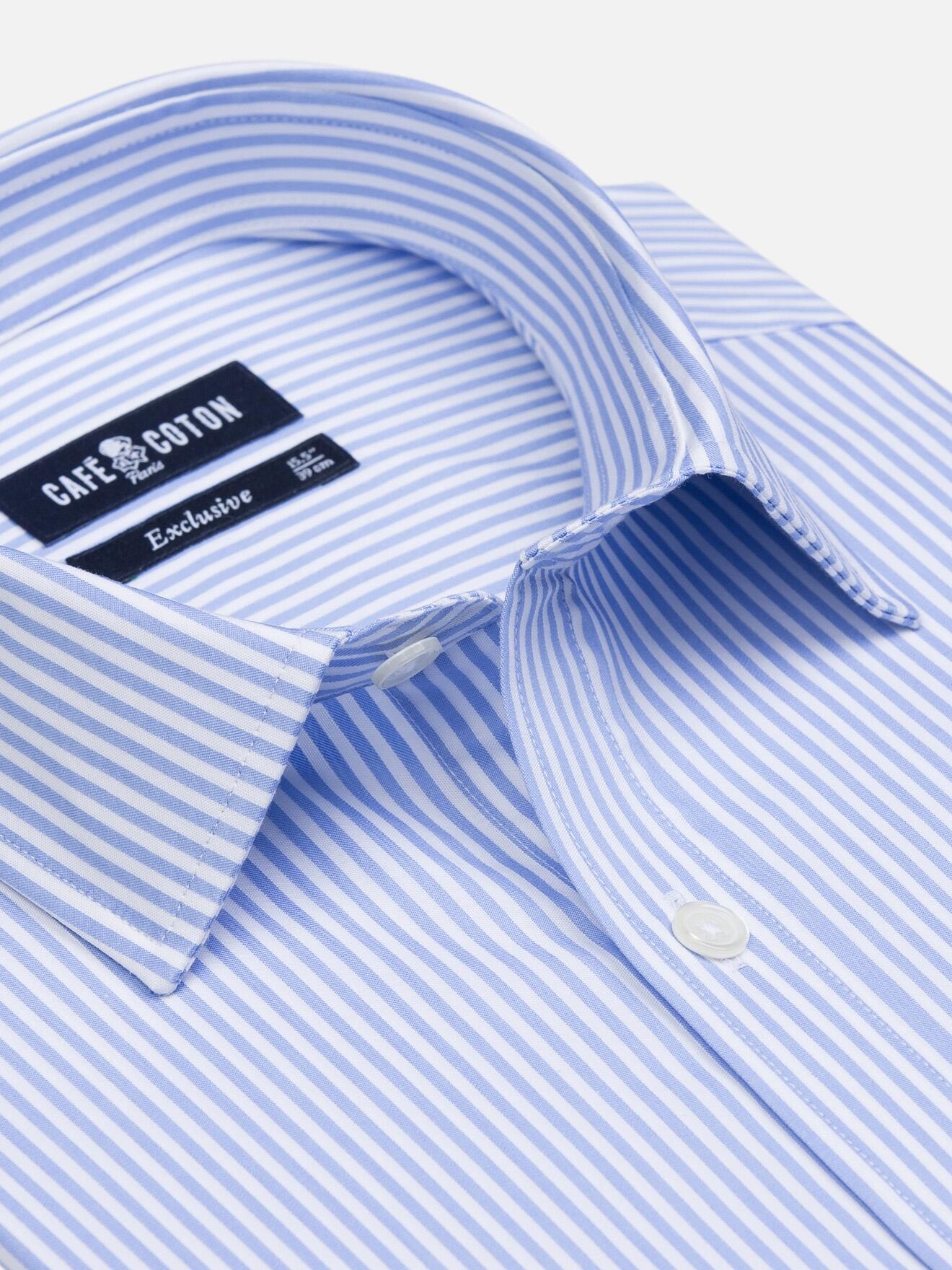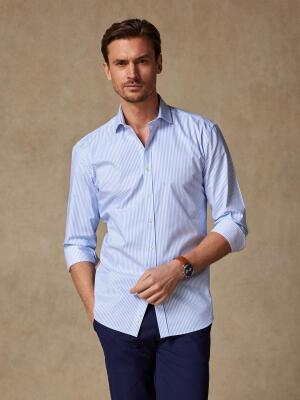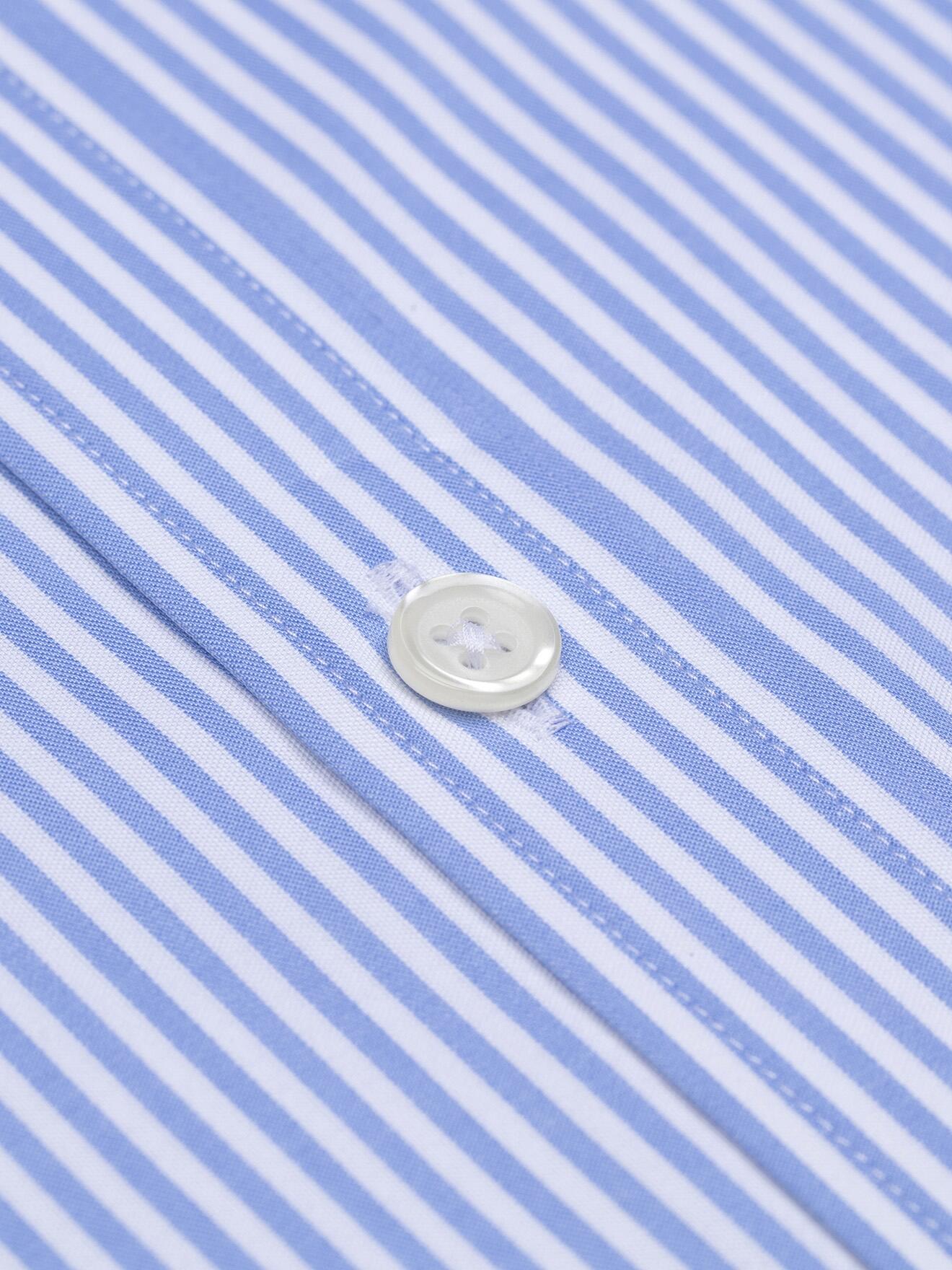 Dieses ikonische Hemd vermittelt einen modernen, städtischen Geist. Die kompakte Webart aus feinstem Baumwollpopeline verleiht dem Hemd eine makellose Qualität und einen einzigartigen Griff. Mit subtilen himmelblauen Streifen verleiht es einen entschiedenen Sommerlook.