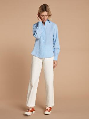 Inspired by the male cloakroom, this iconic linen shirt translates a modern and authentic spirit. Its flexible neck and its contemporary straight cut illustrate a singular femininity. Declined in a dreamy azure hue, it will accompany with carelessness your beautiful summer days.