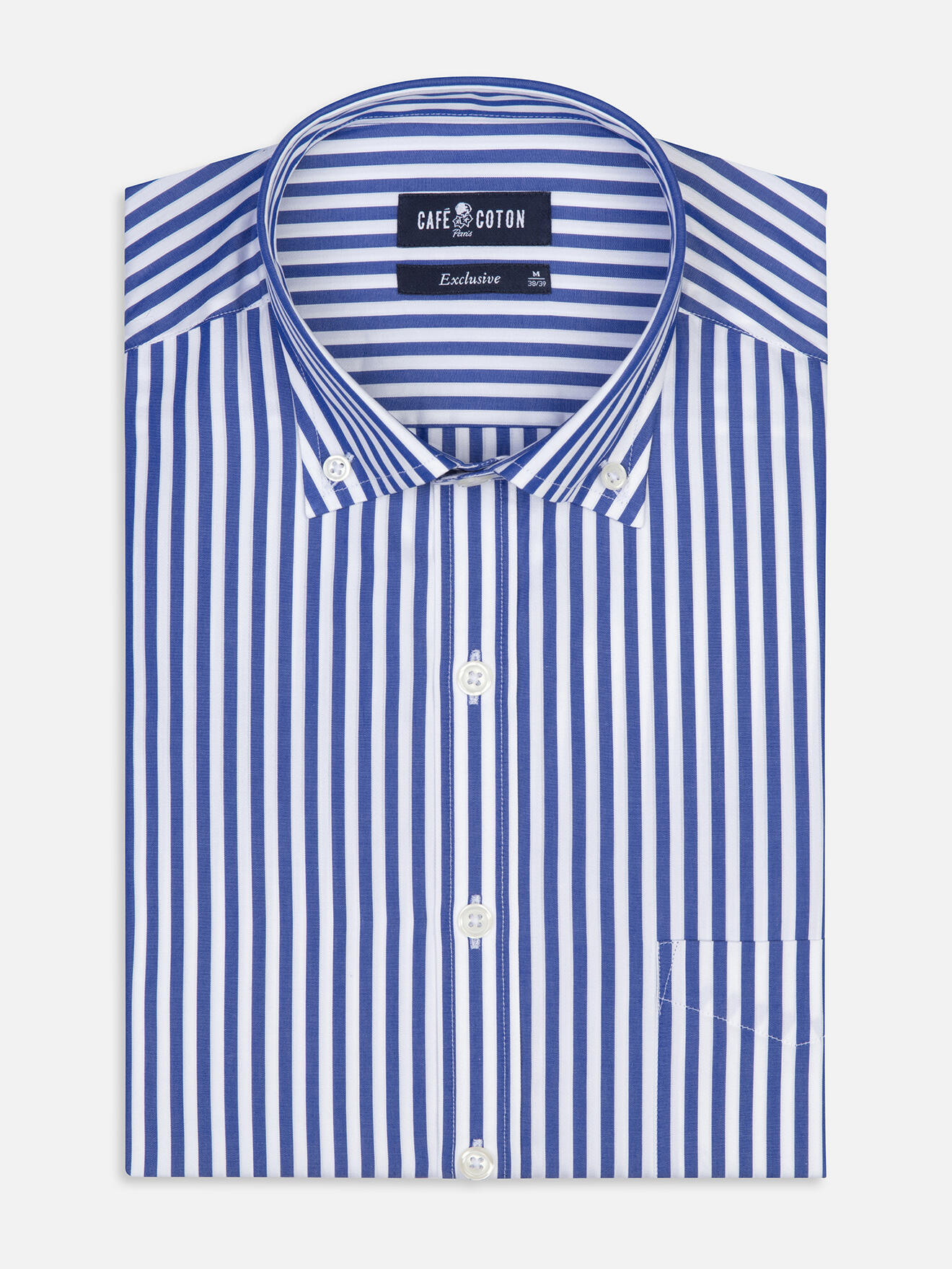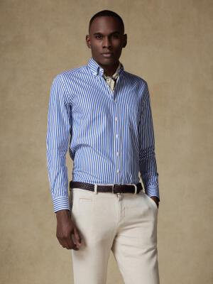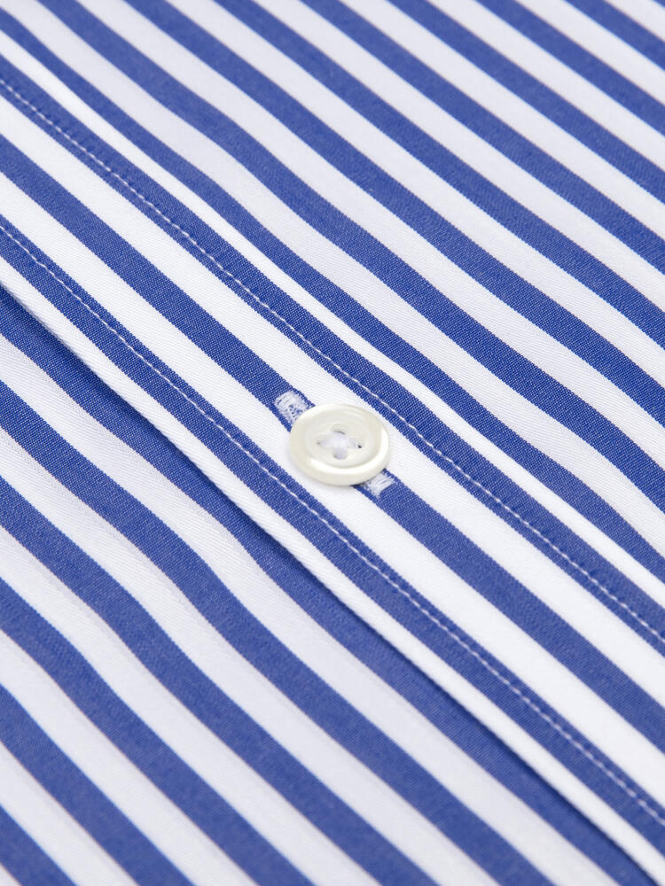 Sophistiquée, cette chemise à rayures s’érige en pièce iconique et ouvre de nouvelles perspectives. Épurée, elle est sublimée par une teinte marine profonde et un twill au relief subtil. La pièce indispensable pour s'évader cette saison…