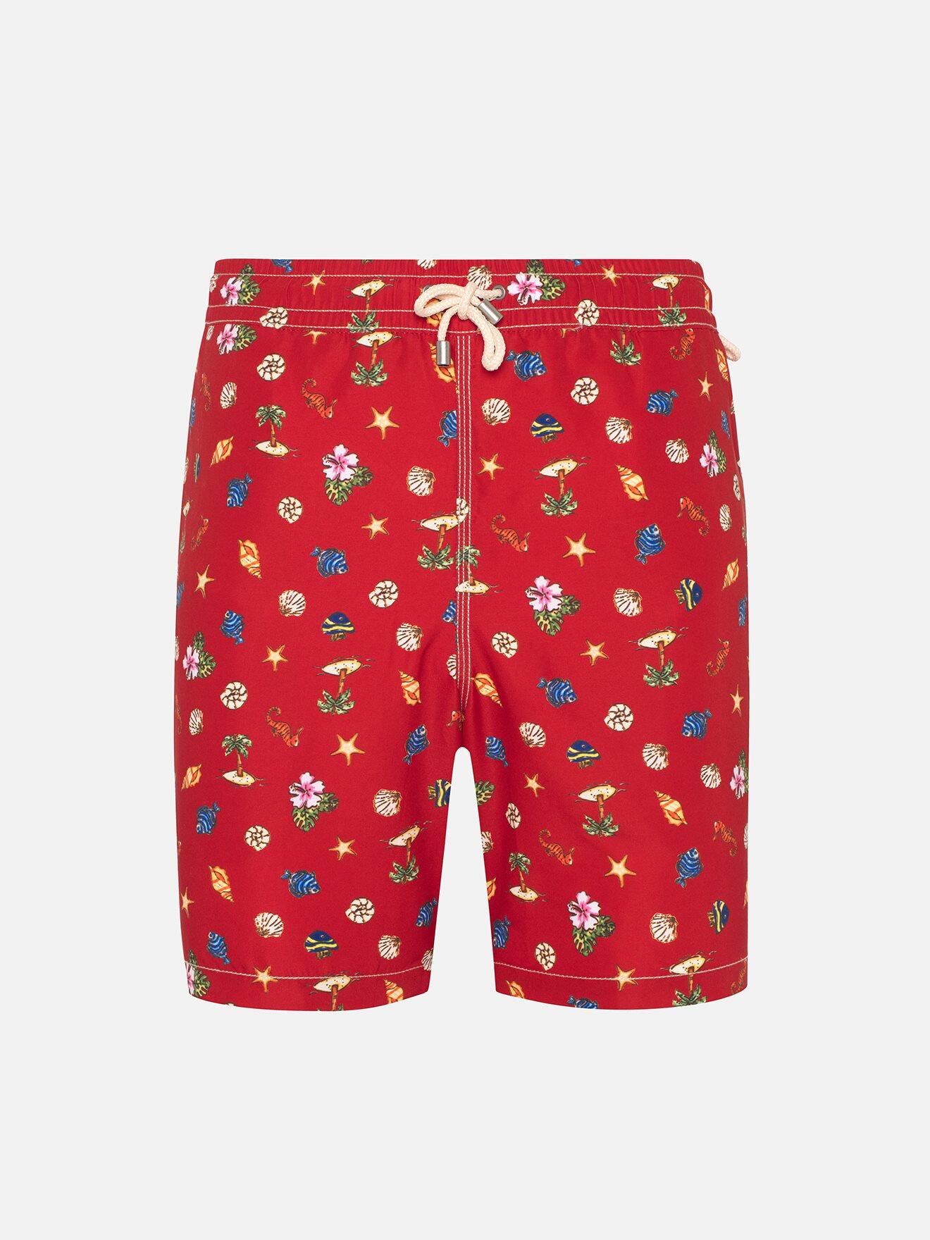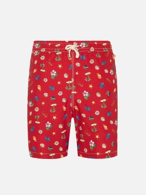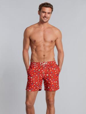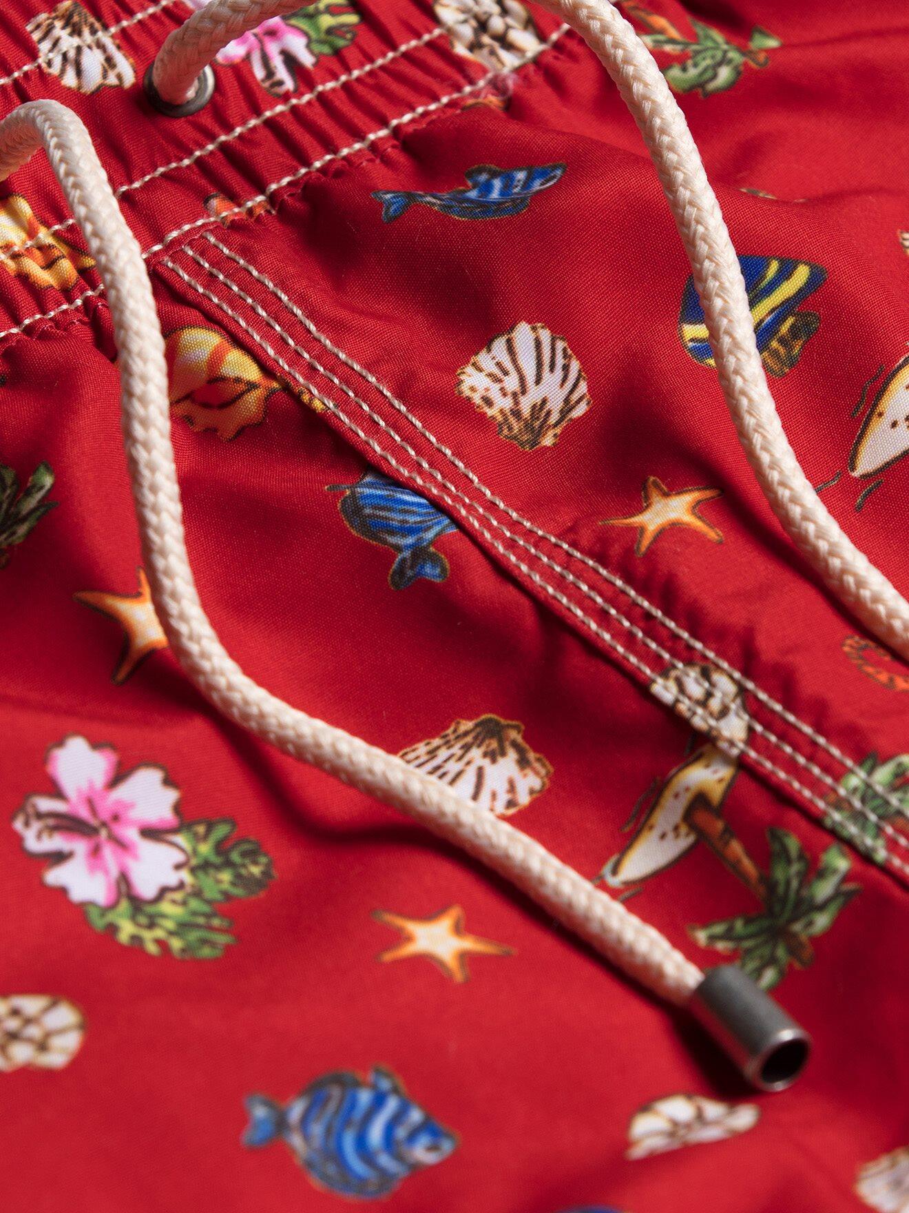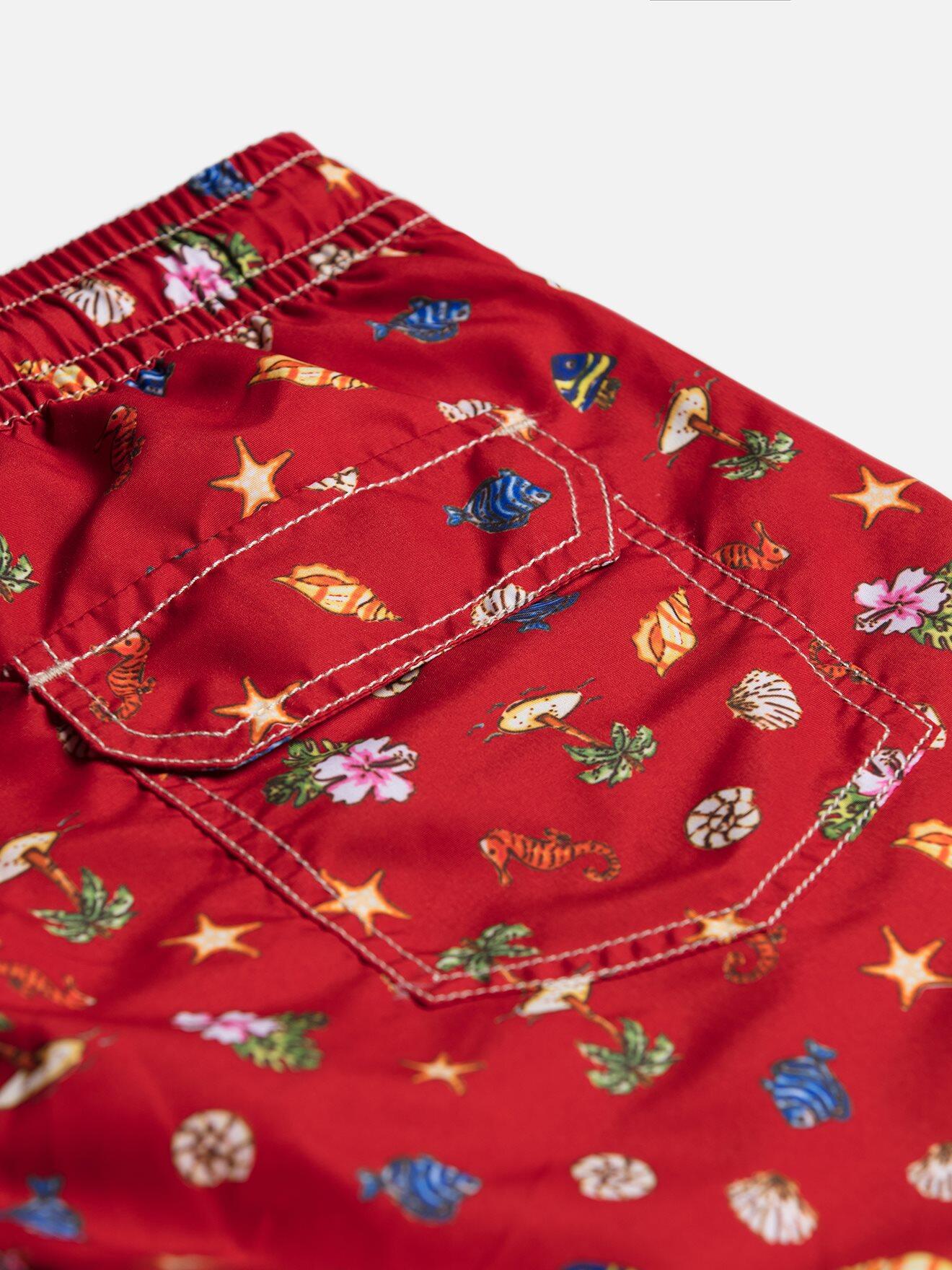 Immediate boarding for idleness and beach! Between seashells, fish and palm trees, bet on a tropical atmosphere to sublimate your bath costume. Enhanced by a back pocket on the back and a canvas on the unique lightness, this jersey with the powerful red h