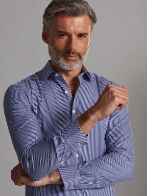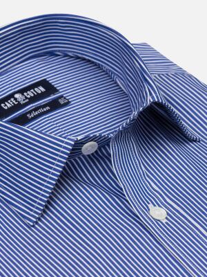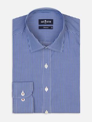This timeless and elegant shirt is made of an exceptional twill known for its fine diagonal lines and density. Decorated with vibrant navy blue stripes and enhanced by refined mother-of-pearl buttons, it reveals a character-filled appearance.