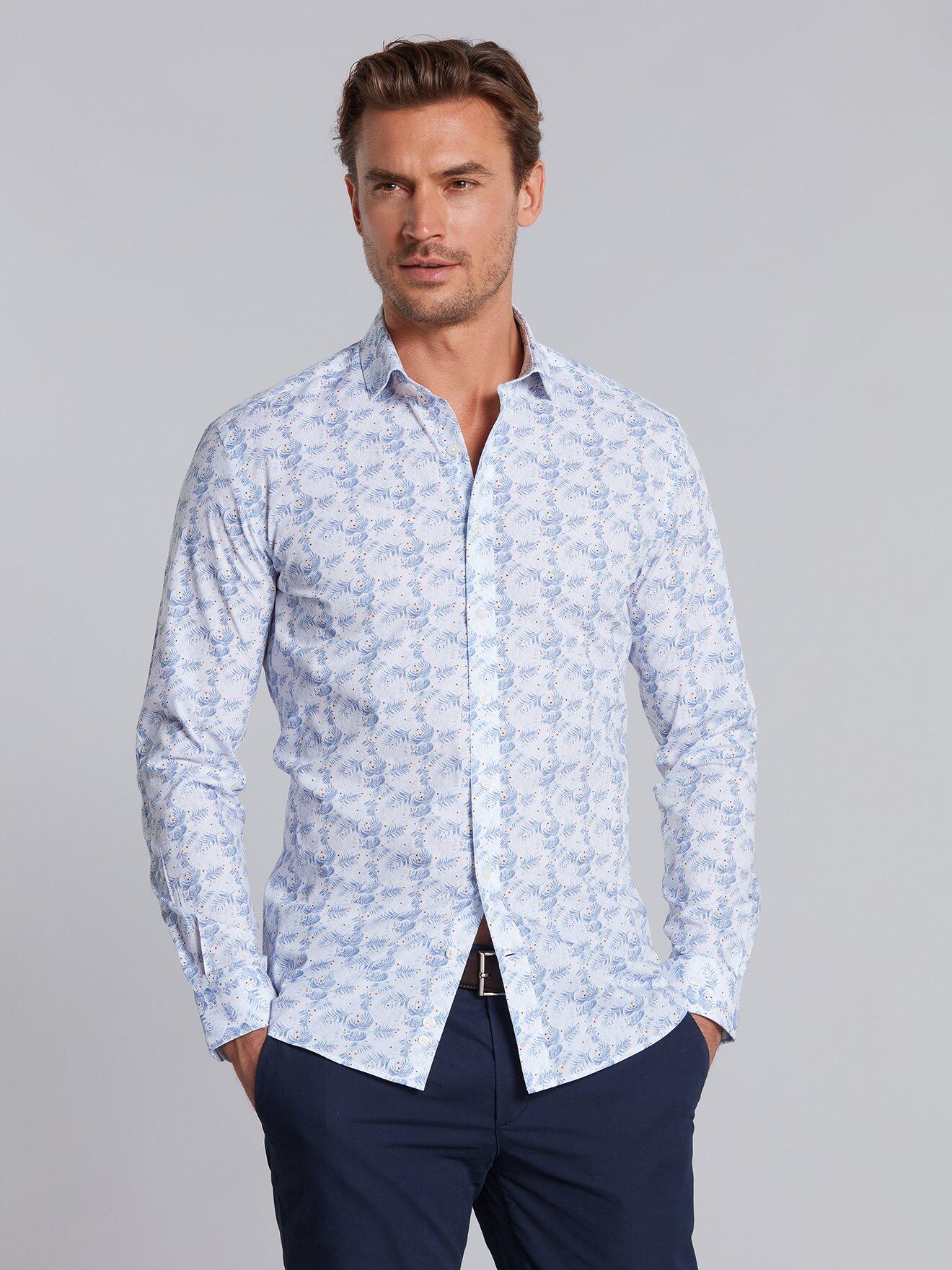White tropical floral blue sky printed poplin slim fit shirt