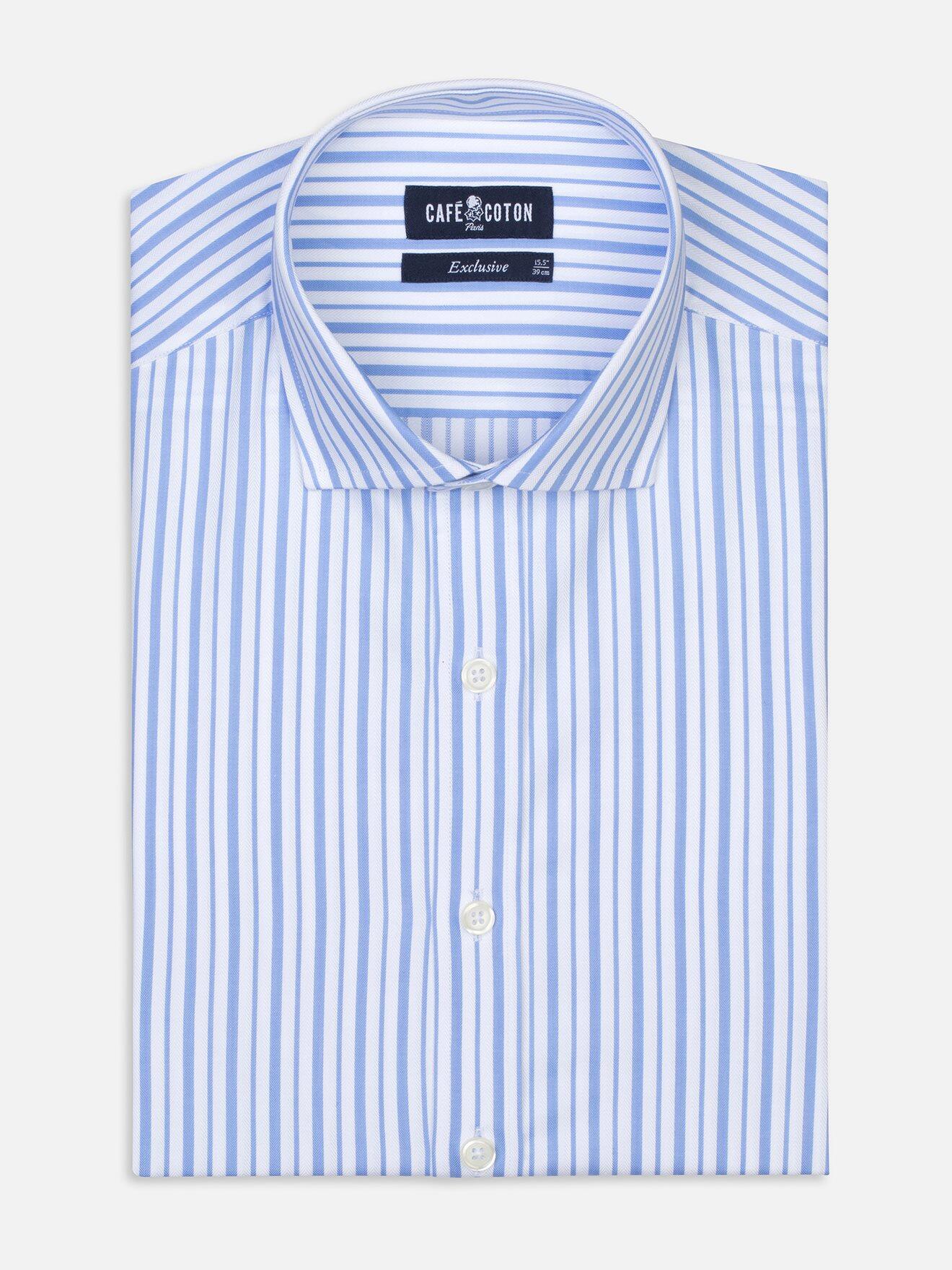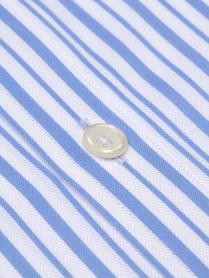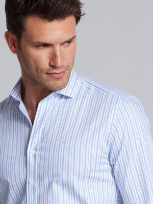 Cette chemise revendique une allure affirmée et un esprit authentique. Elle tire sa quintessence de son tissu en chevron qui met en lumière des rayures ciel à l'effet géométrique subtil. Le compromis idéal pour se démarquer avec audace cet été...