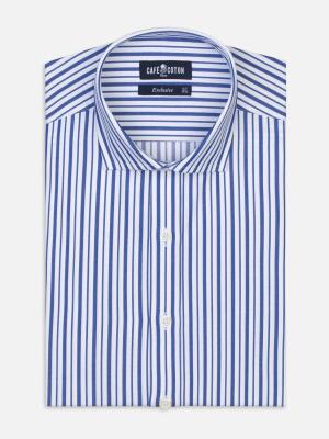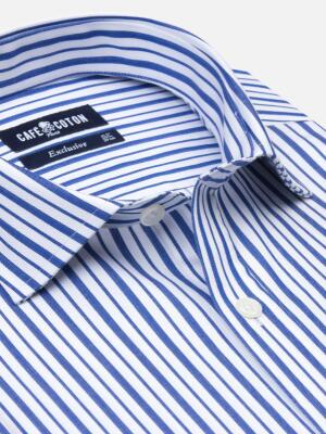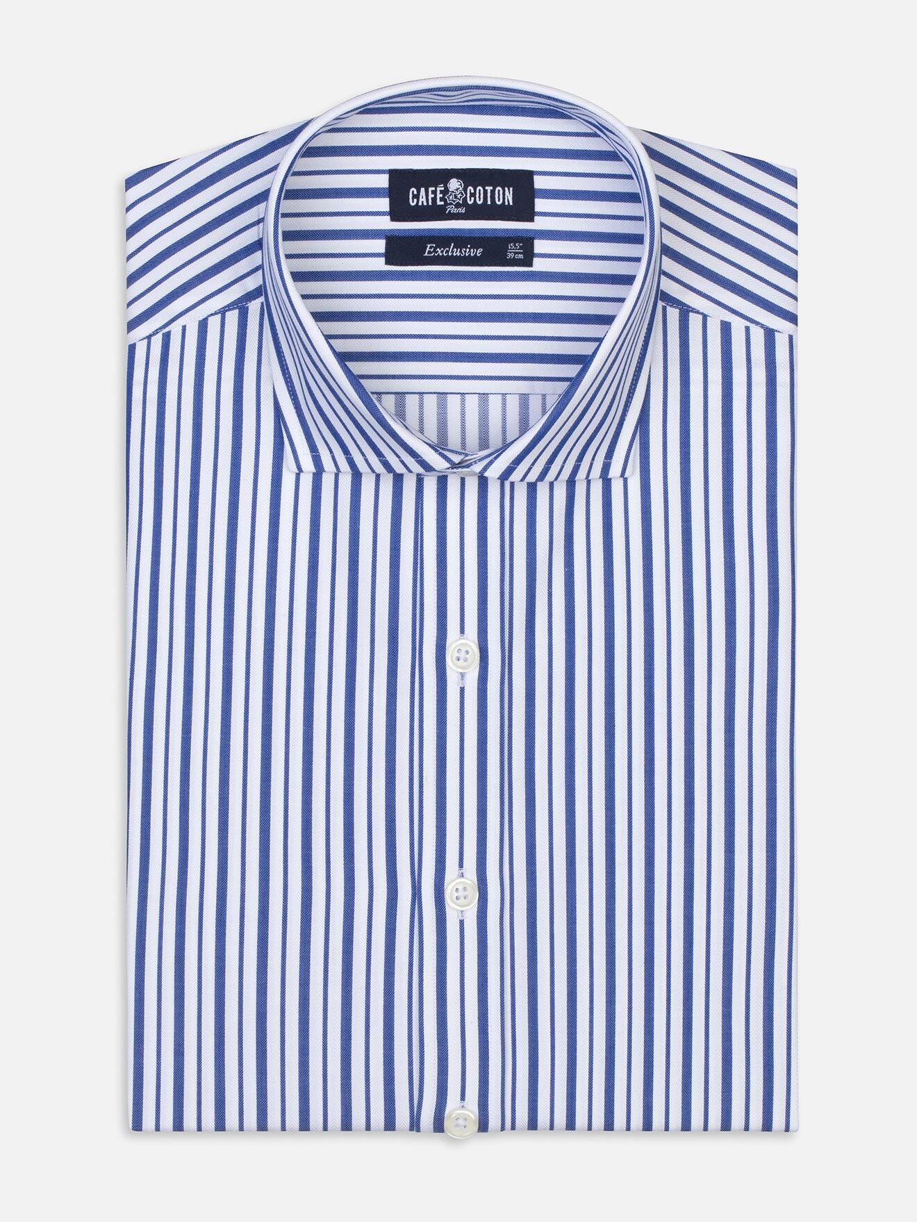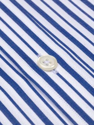 Cette chemise revendique une allure affirmée et un esprit authentique. Elle tire sa quintessence de son tissu en chevron qui met en lumière des rayures bleutées à l'effet géométrique subtil. Le compromis idéal pour se démarquer avec audace cet été...