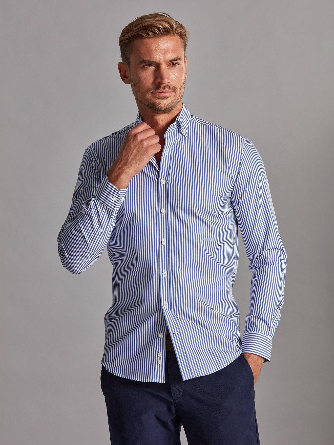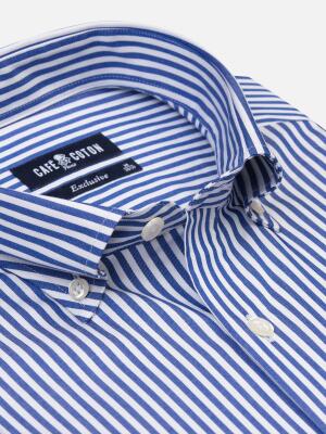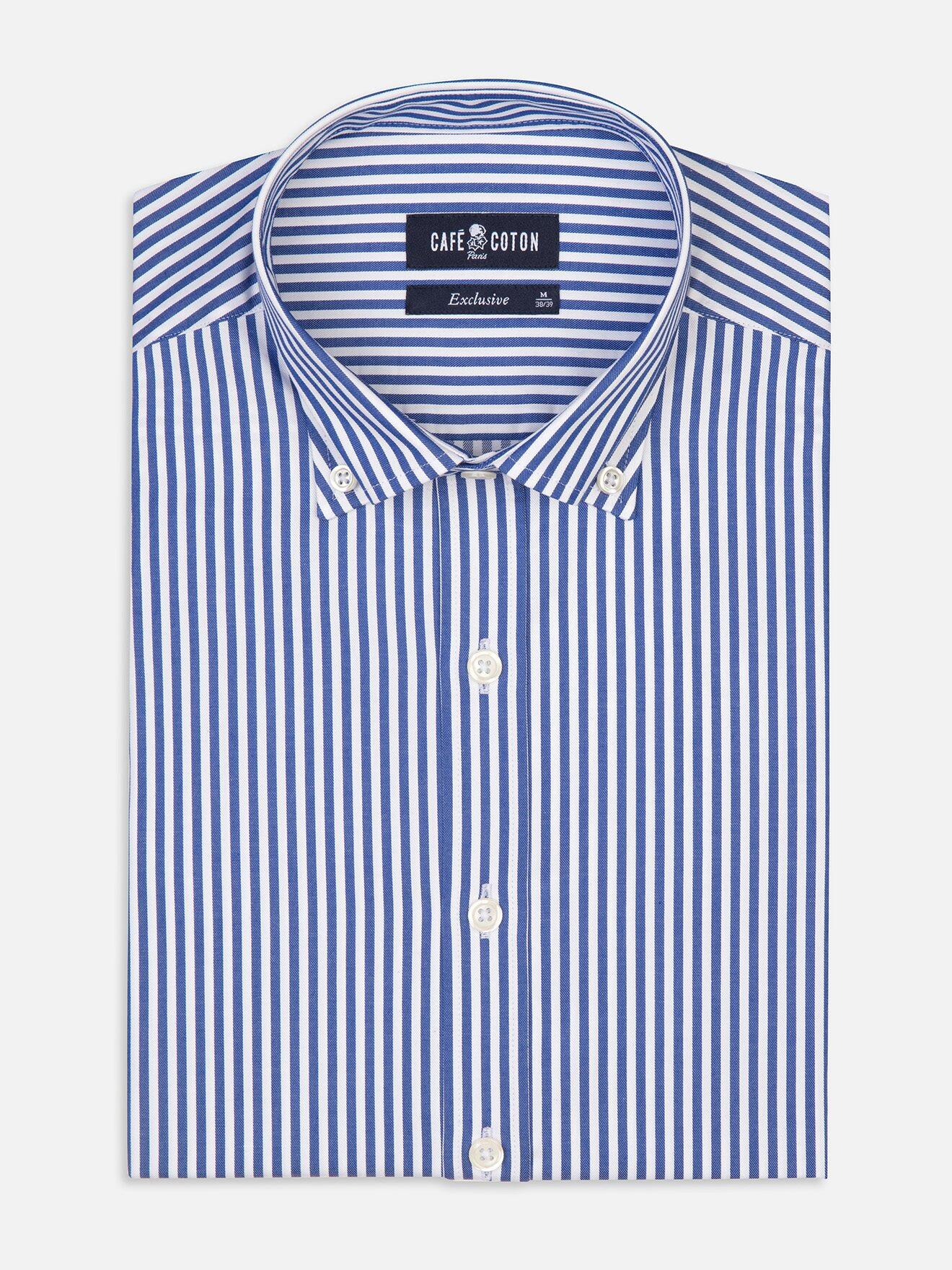 Cette chemise iconique signe un esprit moderne et citadin. Son tissage en twill compact lui confère une qualité irréprochable et un toucher singulier. Une chemise d’exception rehaussée par des rayures marine à la luminosité éclatante.