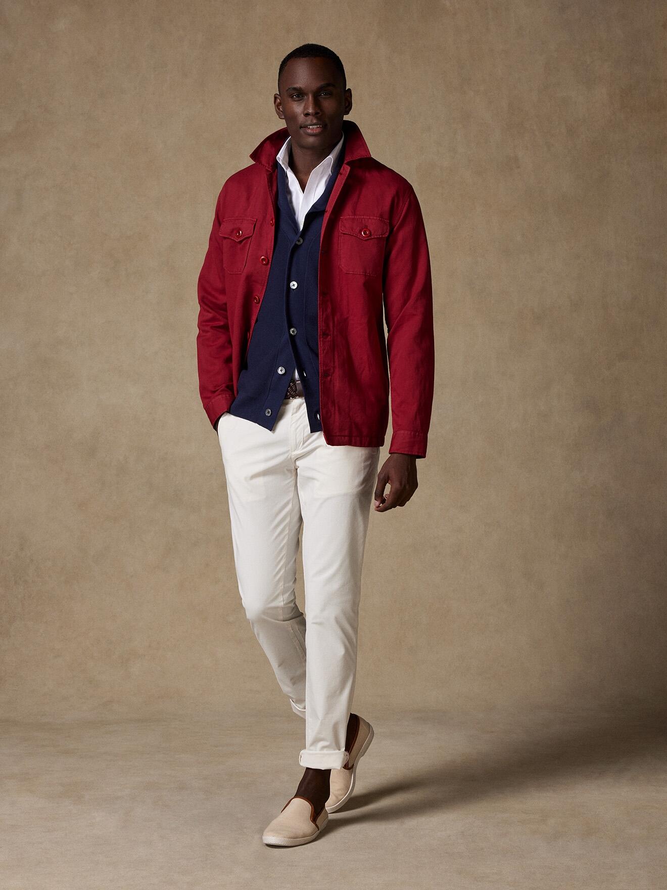 CAFÉ COTON innove cet été et propose une surchemise carmin inspirée de l’univers des vestes de travail traditionnelles. À mi-chemin entre la veste et la chemise, cette pièce polyvalente pleine de caractère se joue des codes et des volumes pour vous offrir une variété de styles incomparable. Elle met en lumière un tissage en coton & lin à la teinte marine profonde et à la main singulière. La pièce phare de la collection qui vous accompagnera au gré des saisons…