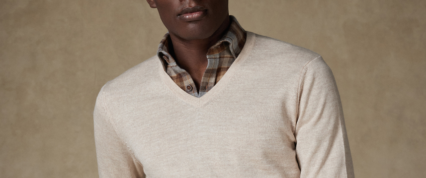 I nostri maglioni con scollo a V sono un capo base del guardaroba maschile, con uno scollo a V poco profondo e possono essere perfettamente abbinati a una camicia per un look unico e raffinato.
